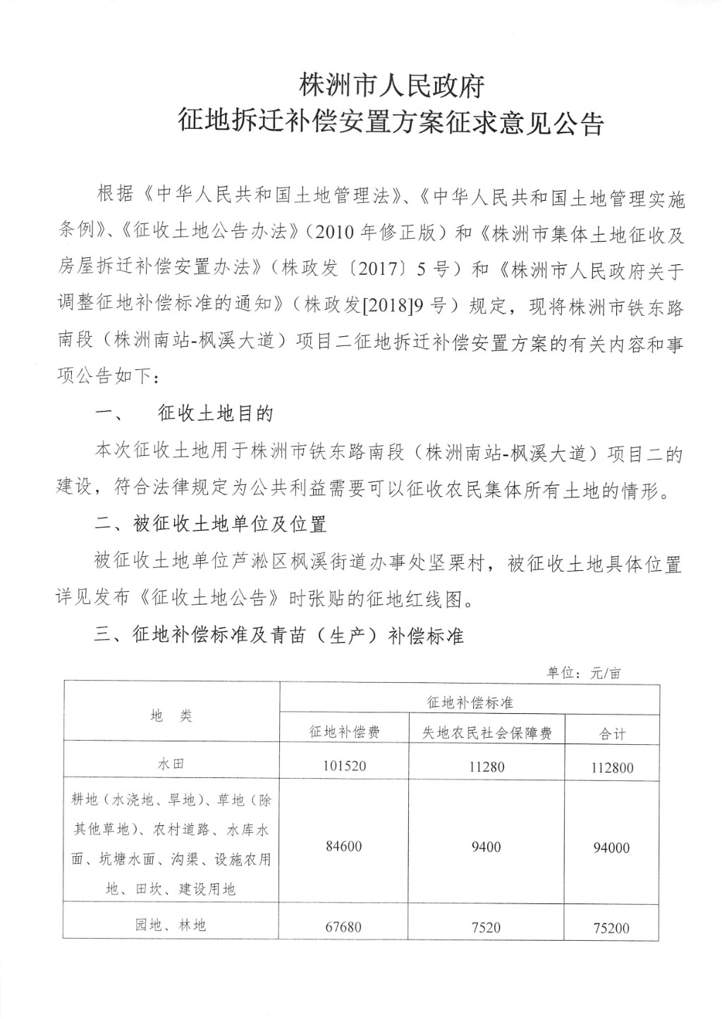 征地拆迁补偿安置方案征求意见公告--株洲市铁东路南段(株洲南站--枫溪大道)项目二