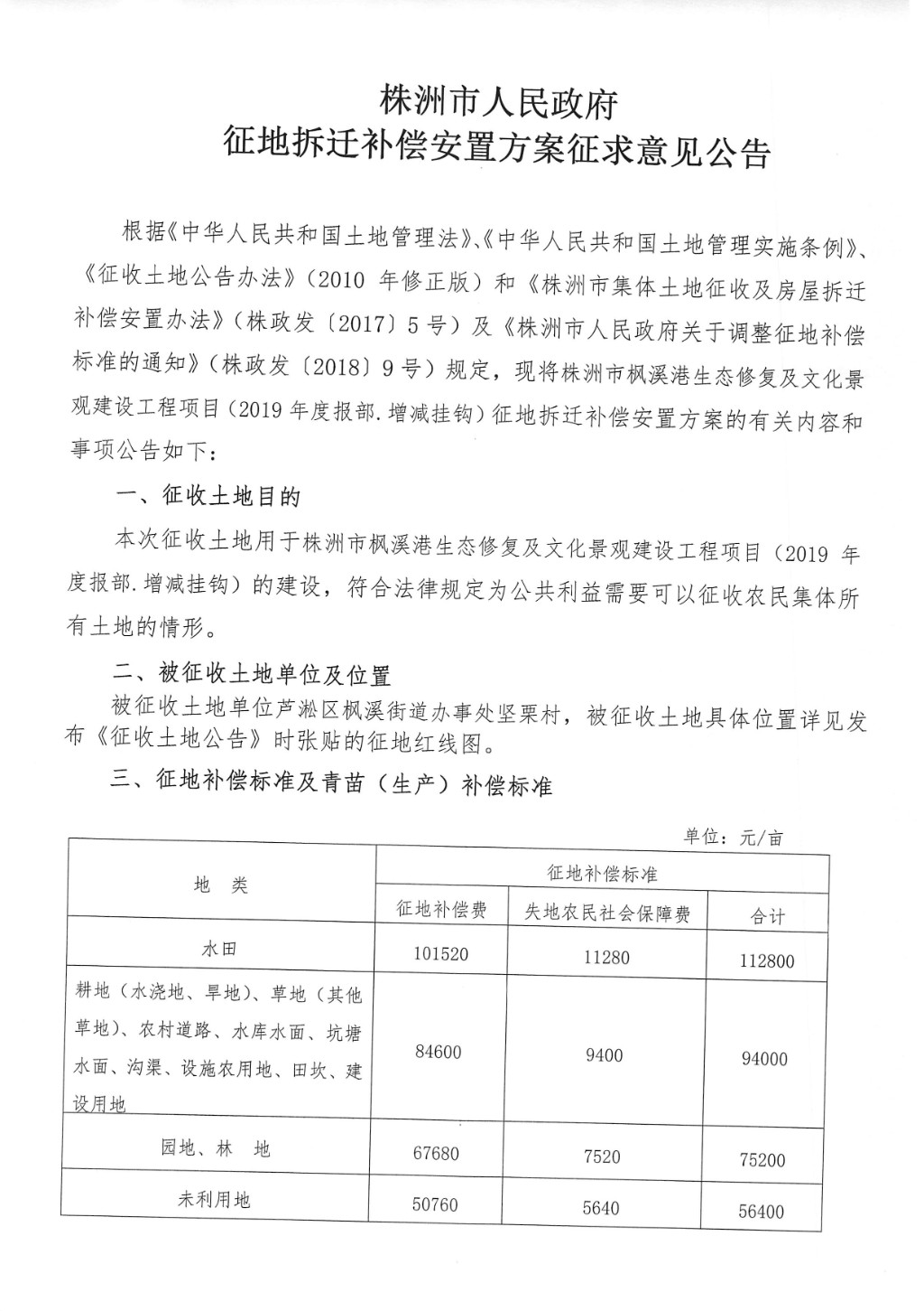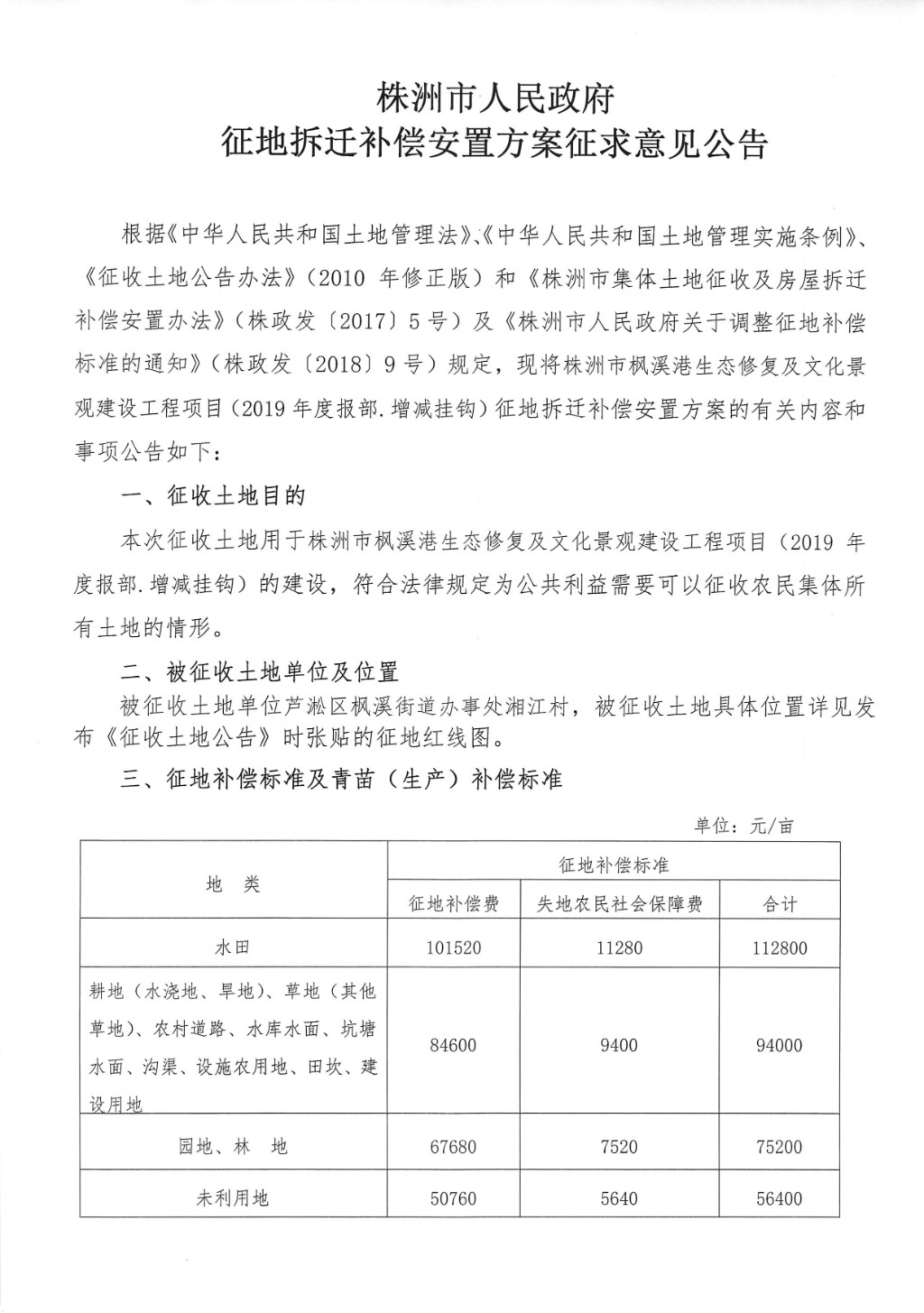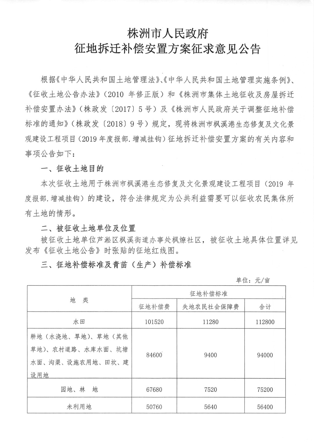征地拆迁补偿安置方案征求意见公告--株洲市枫溪港生态修复及文化景观建设工程项目(2019年度报部.增减挂钩)