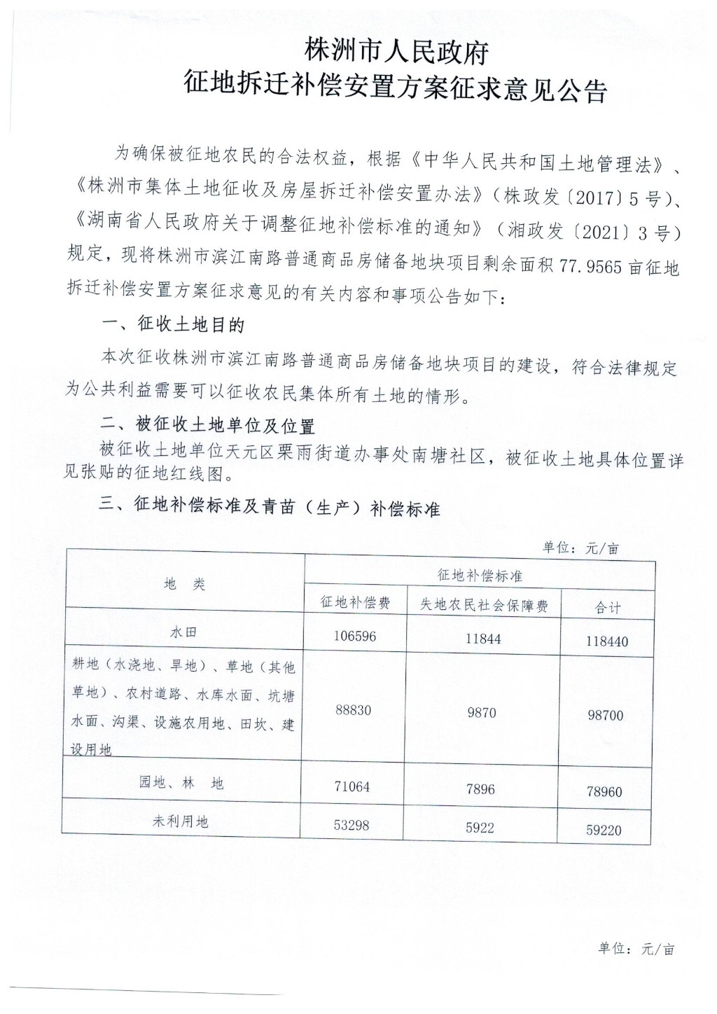 征地拆迁补偿安置方案征求意见公告—株洲市滨江南路普通商品房储备地块项目