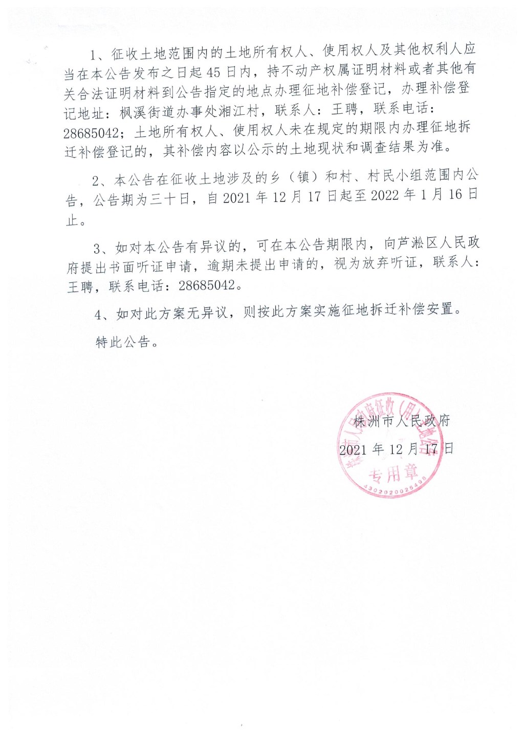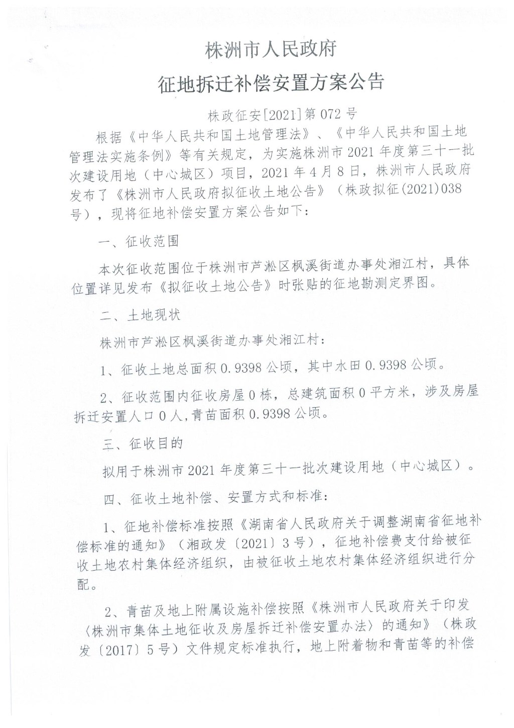 征地补偿安置方案公告株政征安【2021】第072号