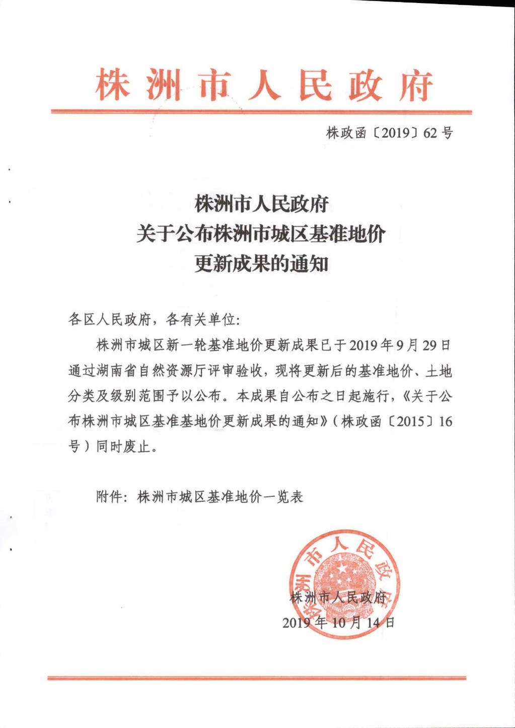 关于公布株洲市城区基准地价更新成果的通知