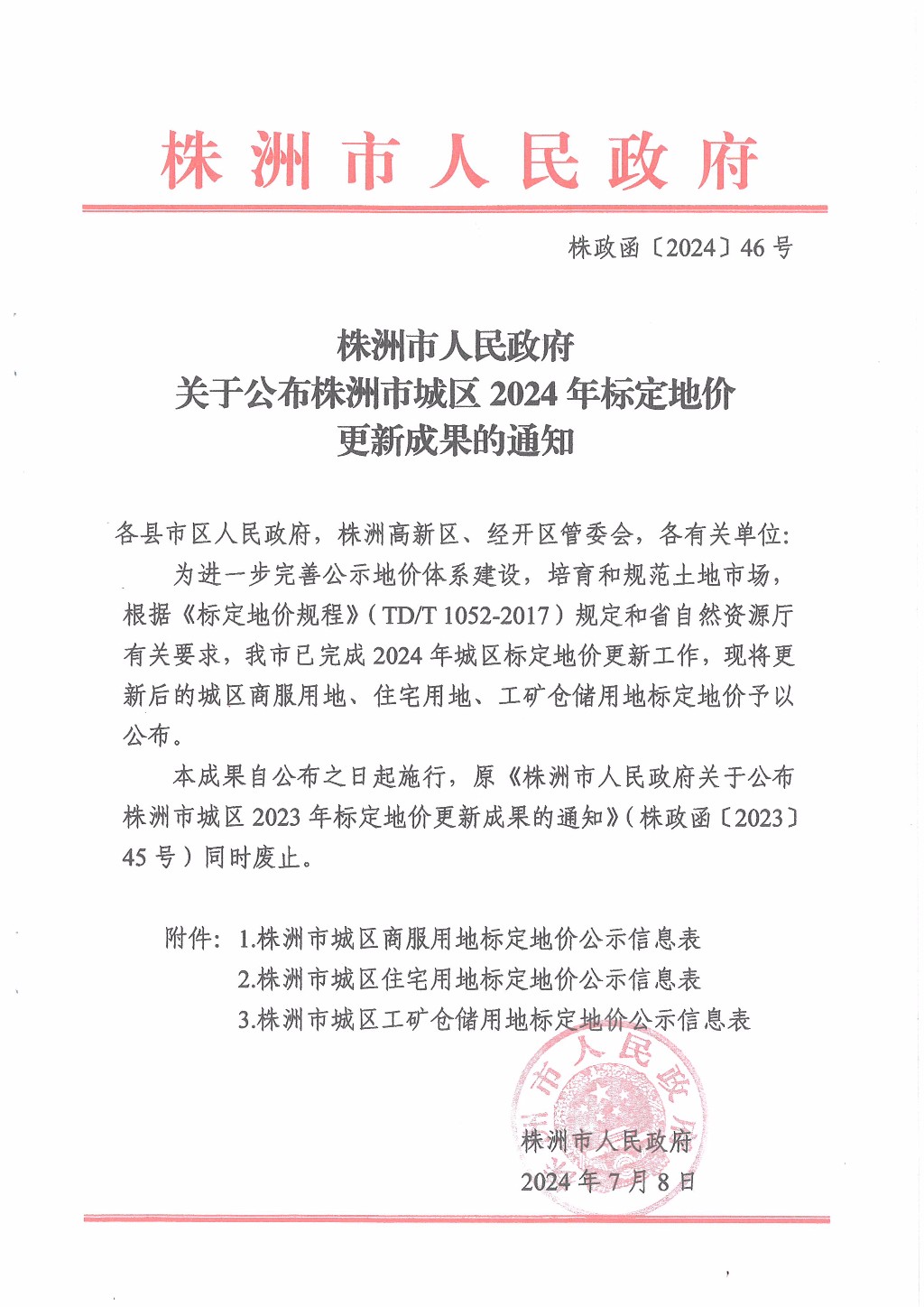 株洲市人民政府 关于公布株洲市城区2024年标定地价更新成果的通知(株政函〔2024〕46号)