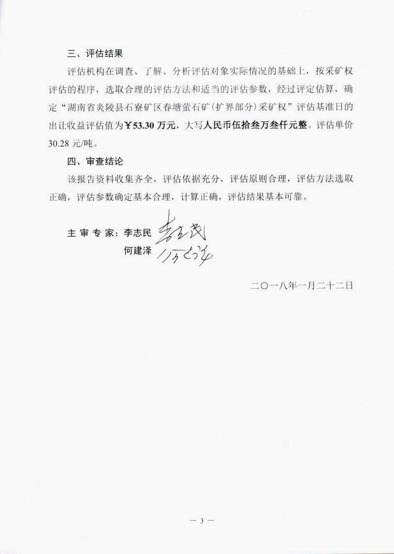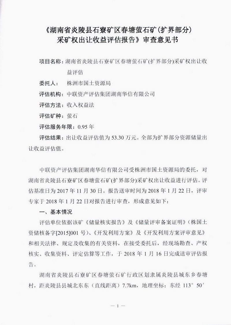 《湖南省炎陵县石寮矿区春塘萤石矿(扩界部分)采矿权出让收益评估报告》审查意见书