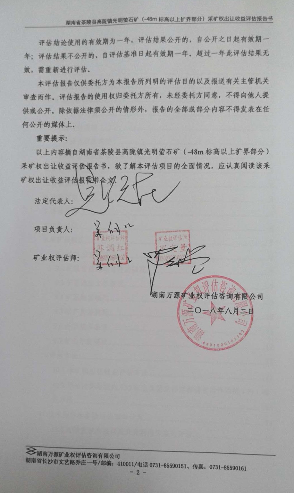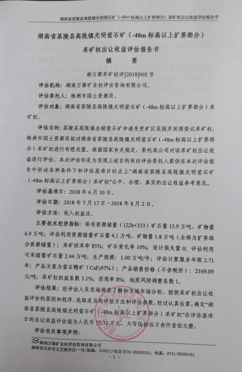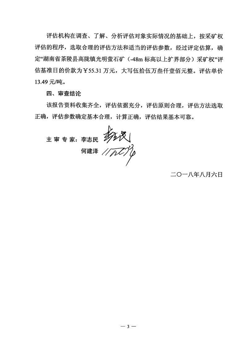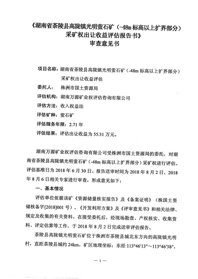 《湖南省茶陵县高垅镇光明萤石矿(-48m标高以上扩界部分)采矿权出让收益评估报告书》审查意见书