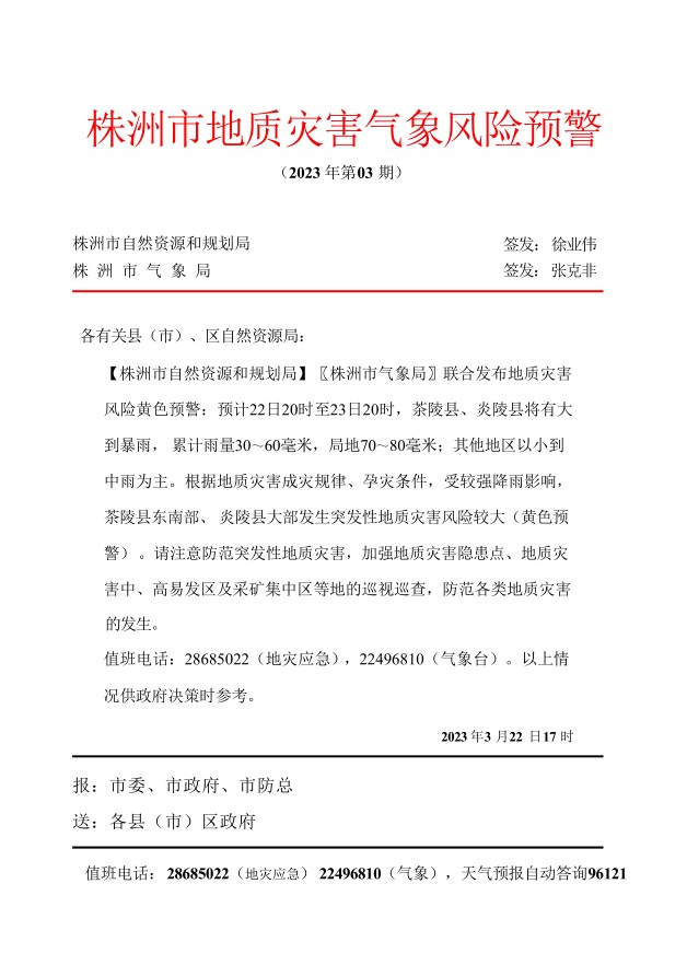 株洲市地质灾害气象风险预警消息第3期