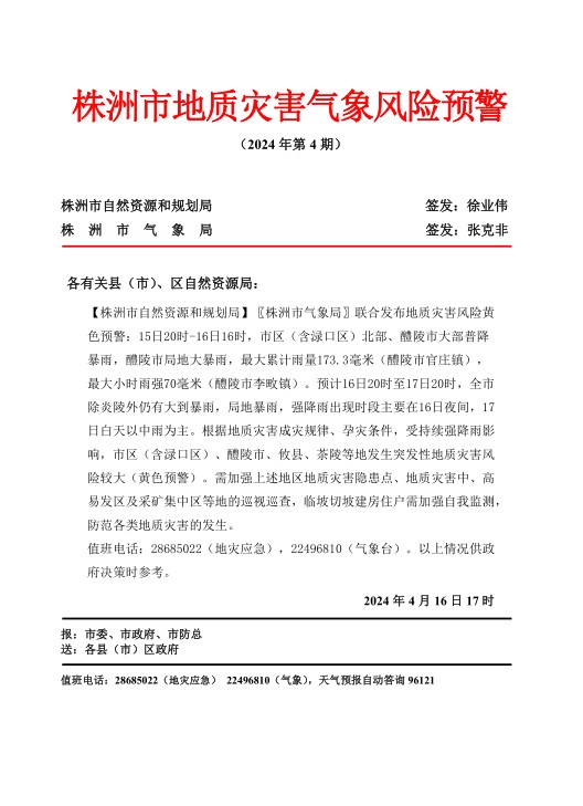 株洲市地质灾害气象风险预警 (2024年第4期)