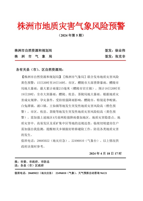 株洲市地质灾害气象风险预警 (2024年第5期)