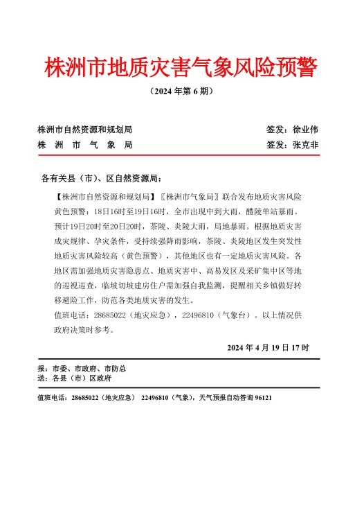株洲市地质灾害气象风险预警 (2024年第6期)