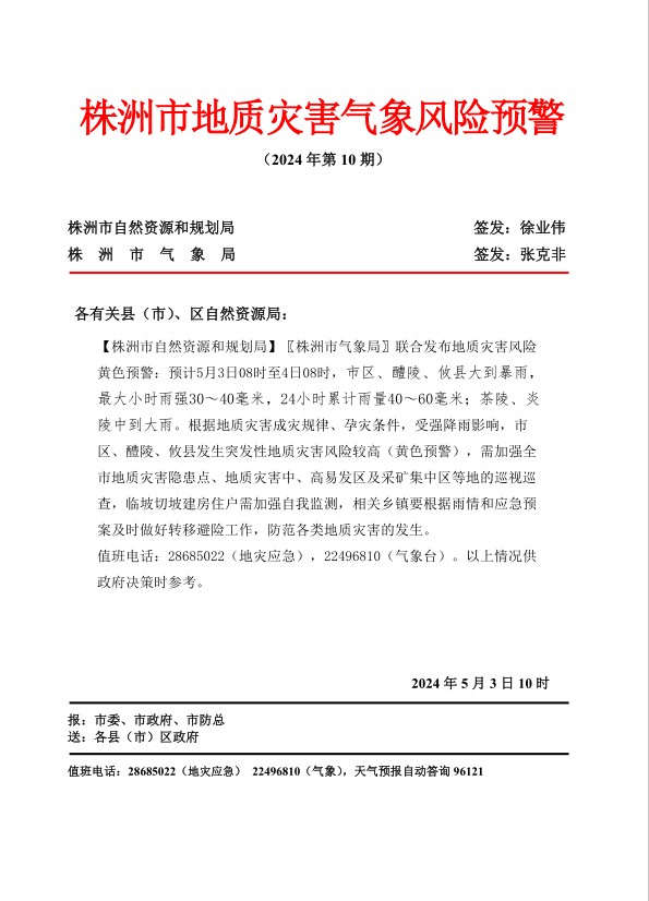 株洲市地质灾害气象风险预警 (2024年第10期)