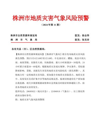 株洲市地质灾害气象风险预警 (2024年第11期)