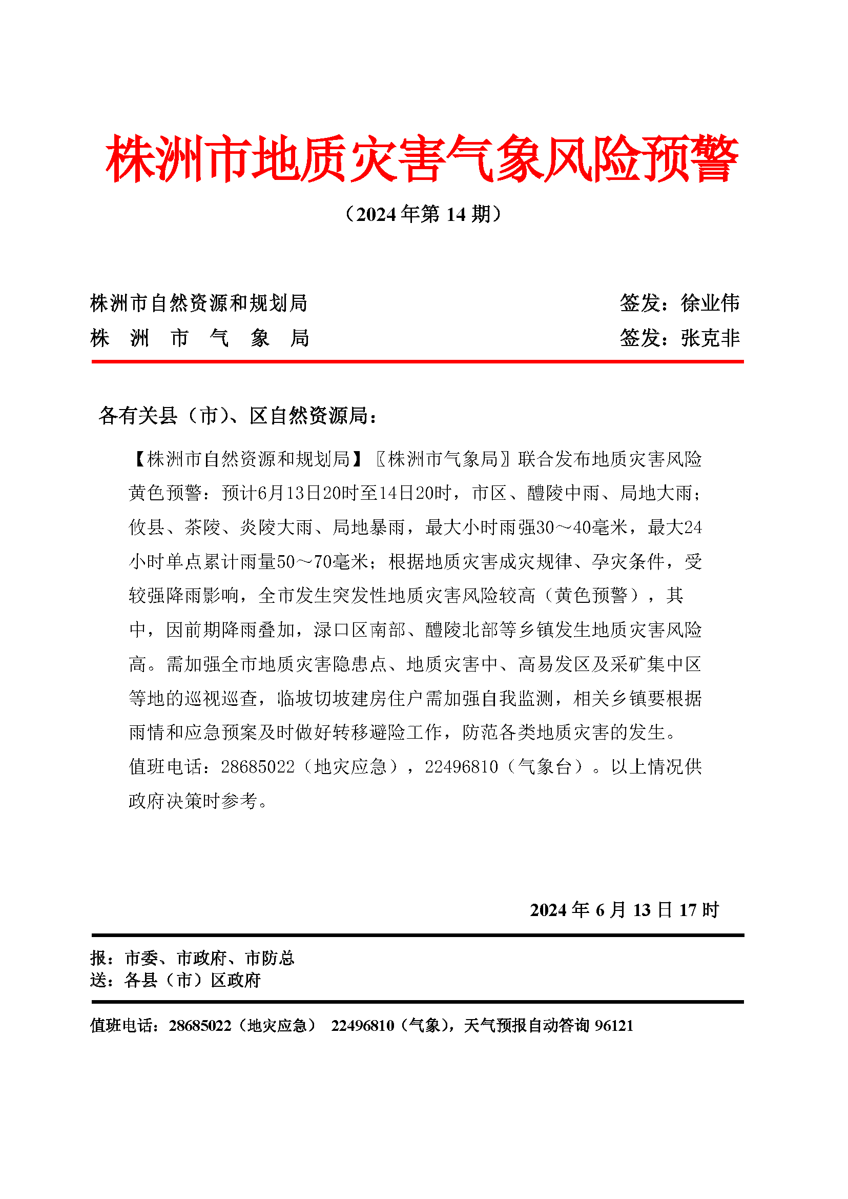 株洲市地质灾害气象风险预警 (2024年第14期)