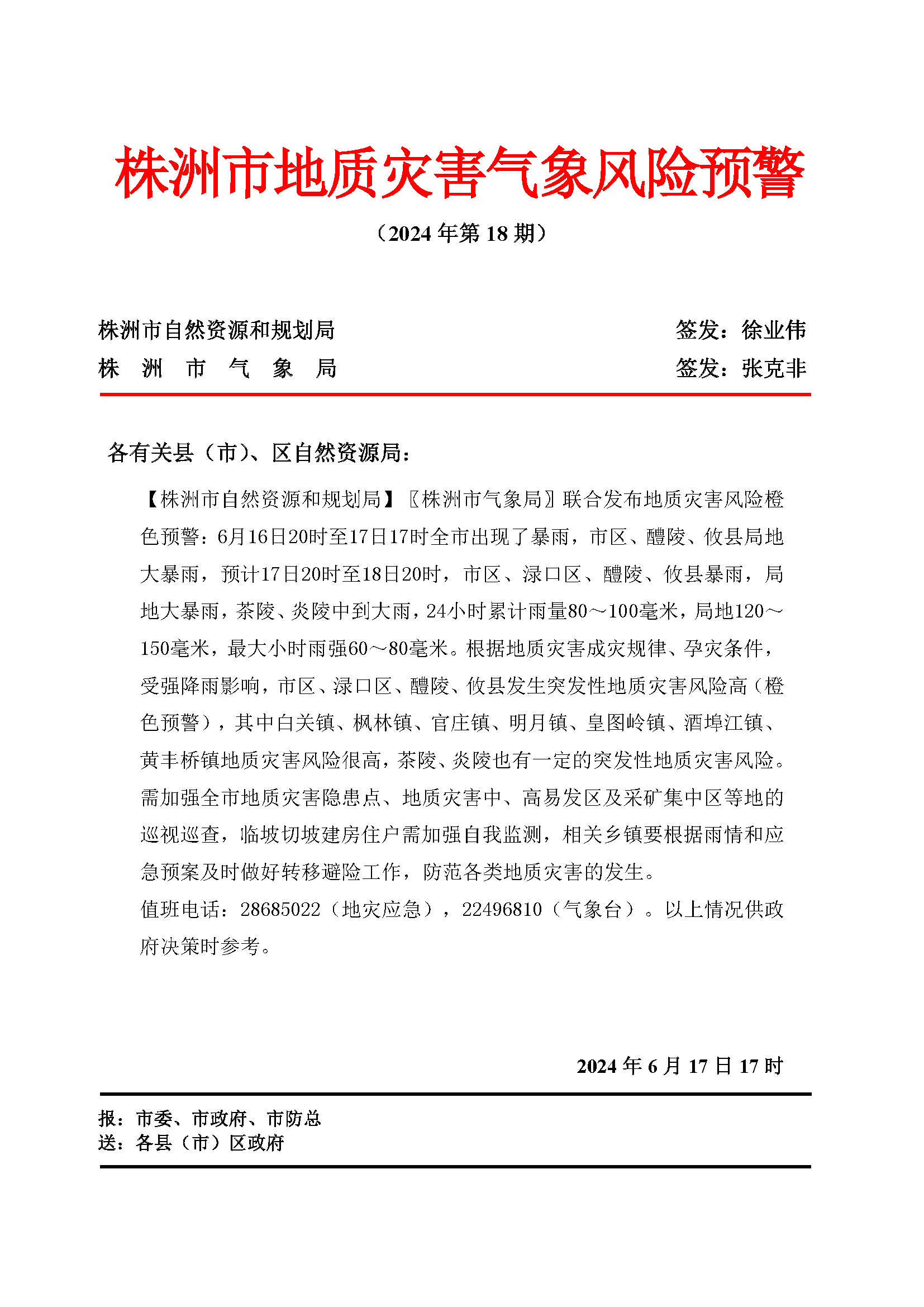 株洲市地质灾害气象风险预警 (2024年第18期)
