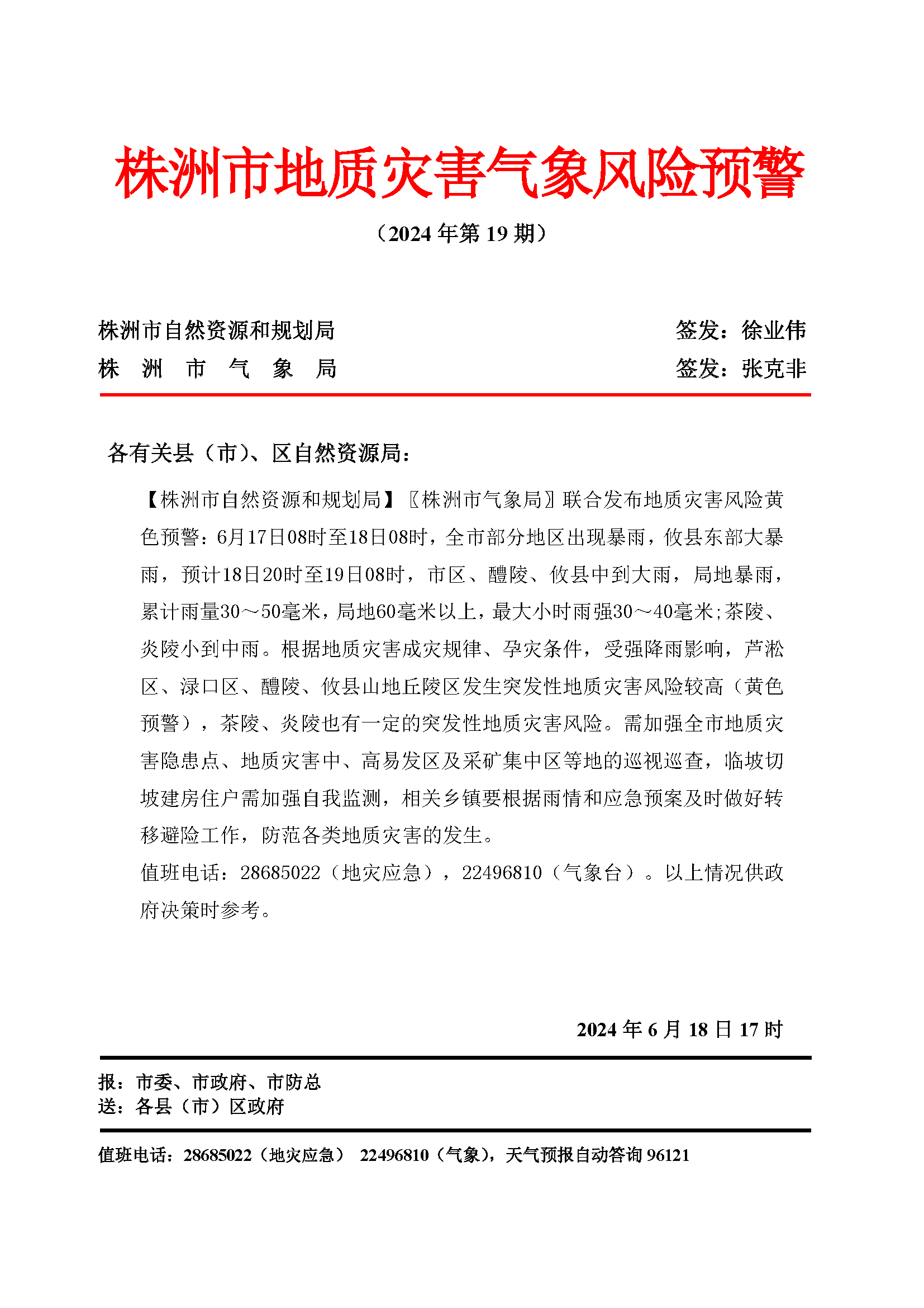 株洲市地质灾害气象风险预警 (2024年第19期)