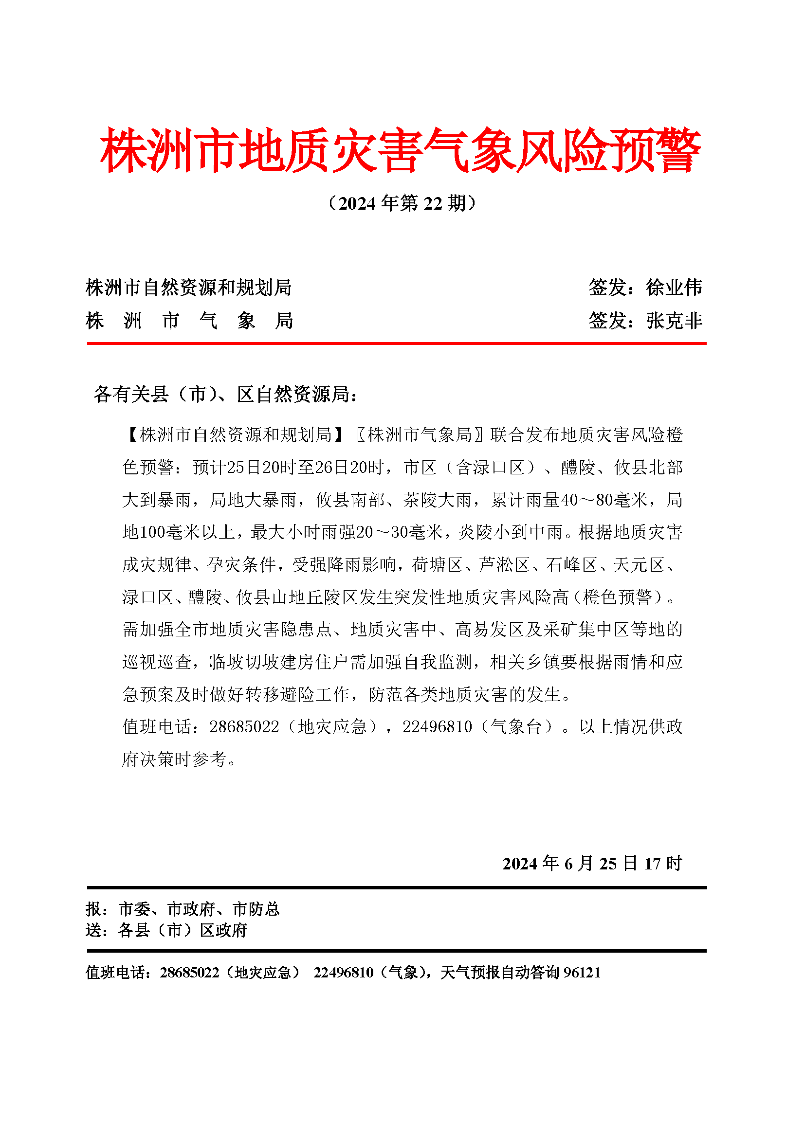 株洲市地质灾害气象风险预警 (2024年第22期)