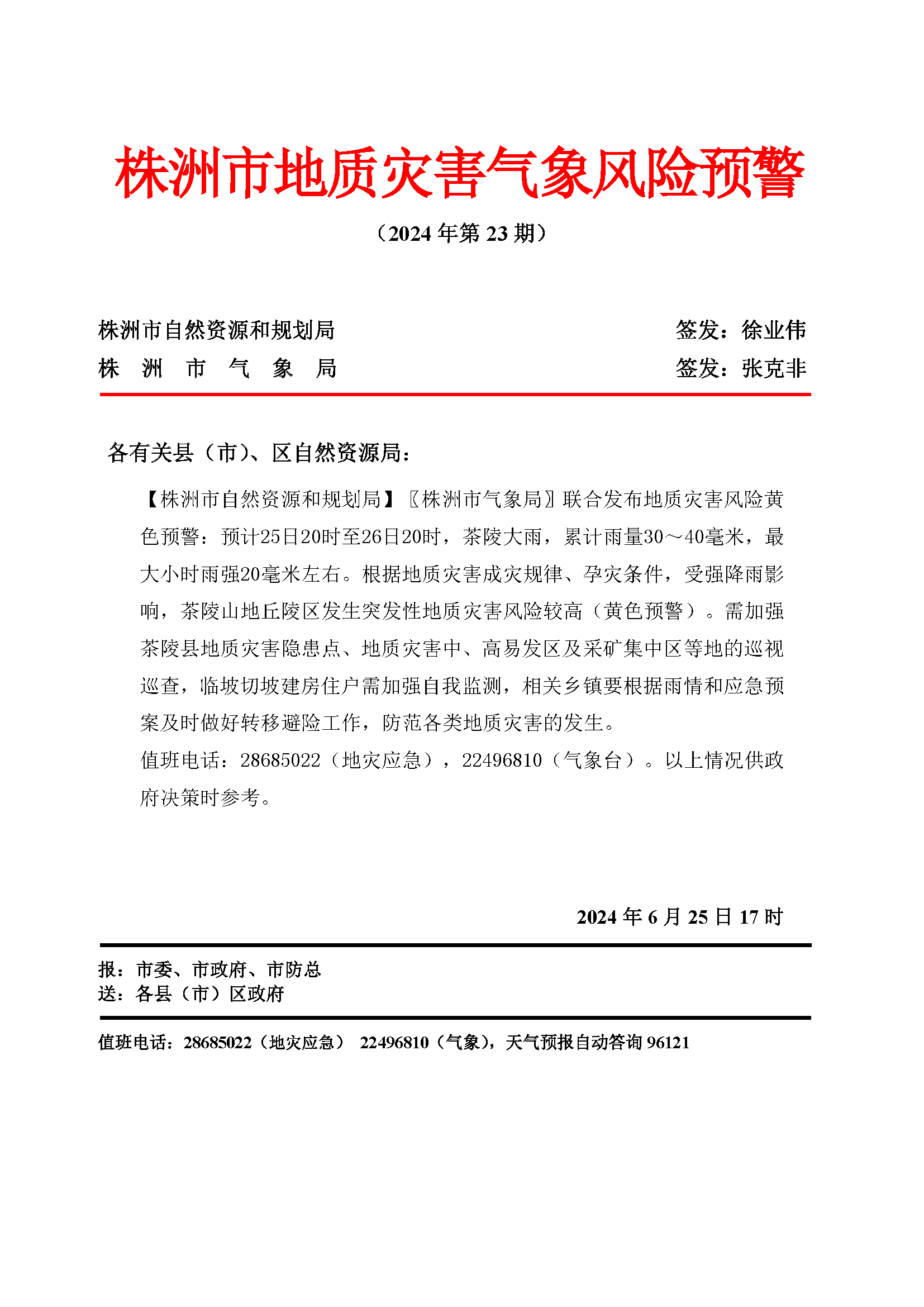 株洲市地质灾害气象风险预警 (2024年第23期)