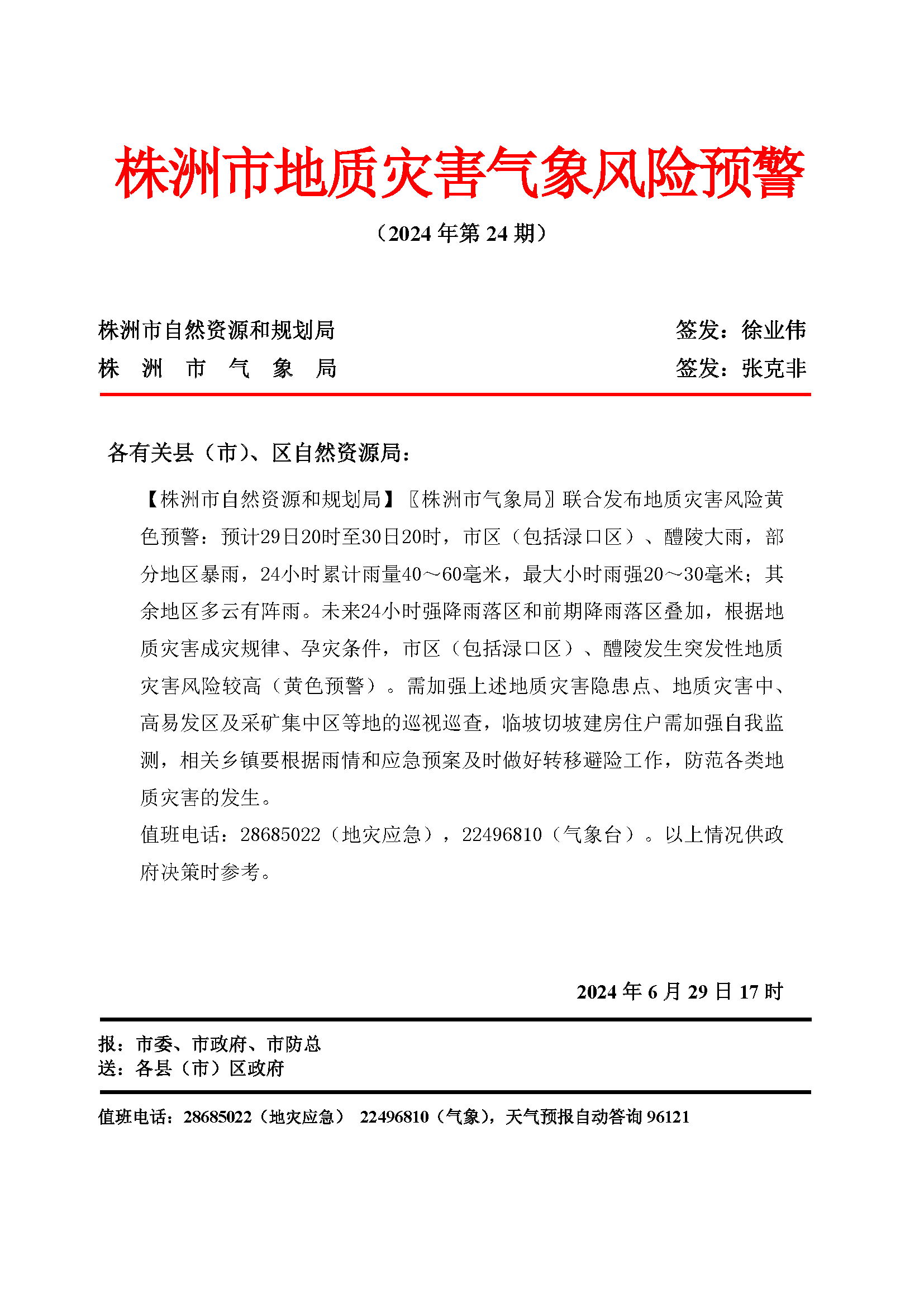 株洲市地质灾害气象风险预警 (2024年第24期)
