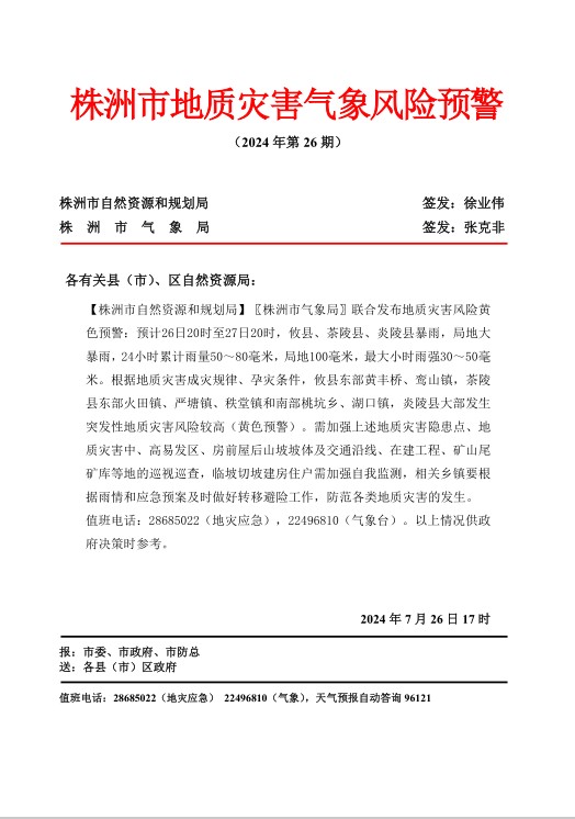 株洲市地质灾害气象风险预警 (2024年第26期)