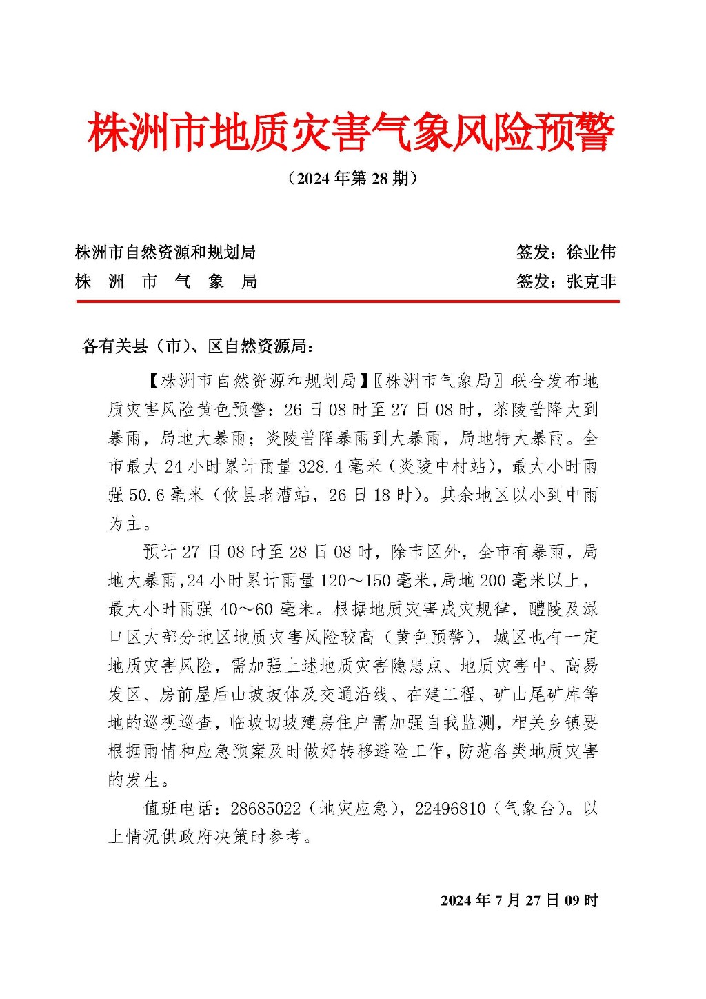 株洲市地质灾害气象风险预警 (2024年第28期)