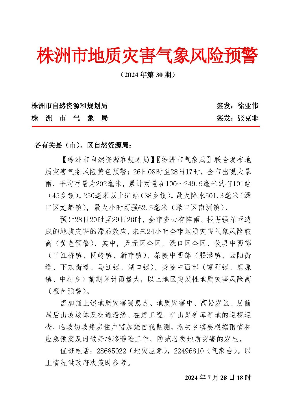 株洲市地质灾害气象风险预警 (2024年第30期)