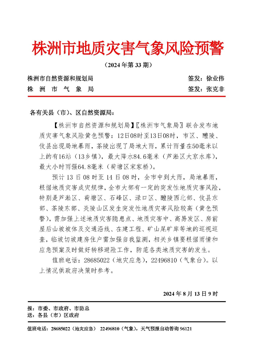 株洲市地质灾害气象风险预警 (2024年第33期)