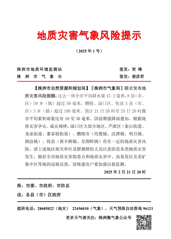 株洲市地质灾害气象风险预警 (2025年第01期)