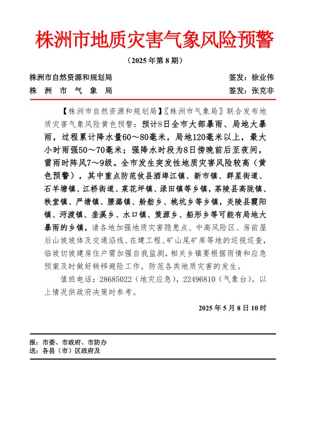 株洲市地质灾害气象风险预警 (2025年第08期)