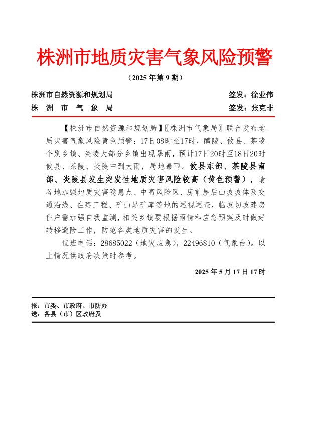 株洲市地质灾害气象风险预警 (2025年第09期)