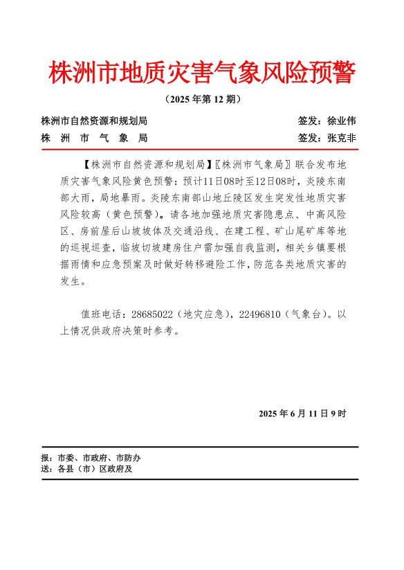株洲市地质灾害气象风险预警 (2025年第12期)