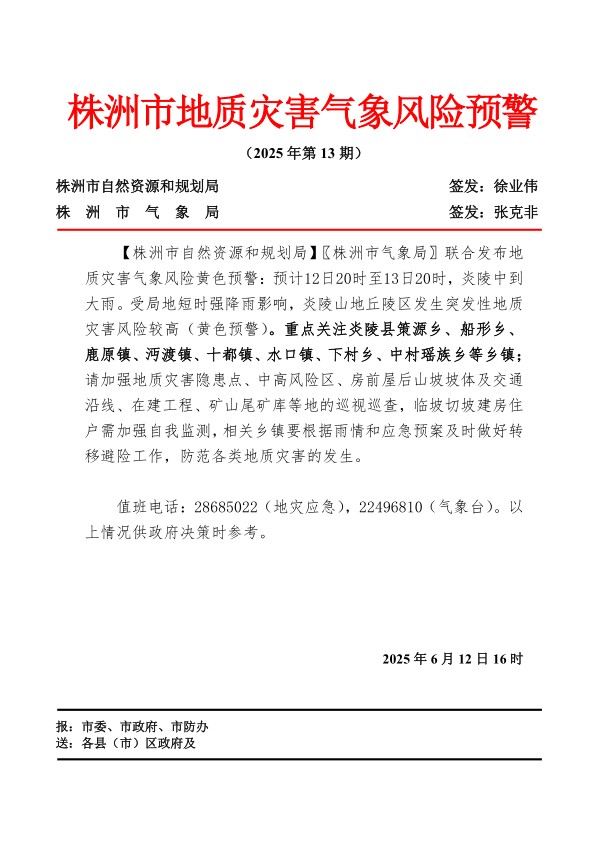 株洲市地质灾害气象风险预警 (2025年第13期)